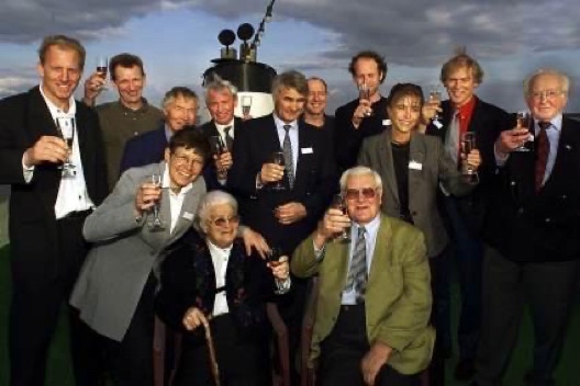Een keur aan schaatsvedetten proost op de negentigste verjaardag van Jaap Havekotte, met naast zich zittend echtgenote Sjaan. V.l.n.r. Rintje Ritsma, Piet Kleine, Reinier Paping, Annie Borckink, Henk van der Grift, Jaap Havekotte jr., Hilbert van der Duim, Ids Postma, Yvonne van Gennip, Ard Schenk en Wim van der Voort.